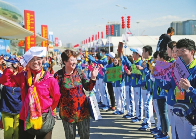 9月25日,第五届中国―亚欧博览会圆满落幕。亚欧博览会的志愿者们举着“大美新疆欢迎您”“后会有期”“中国―亚欧博览会欢迎您再来”等祝福语,在新疆国际会展中心西门列队欢送参展商和观众。 图为当日14时50分,来自重庆的游客陈女士挥手向志愿者们道别。