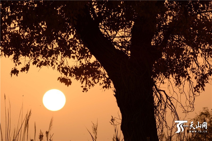 2016年11月2日,胡杨树后冉冉升起的朝阳光芒散射大地。
