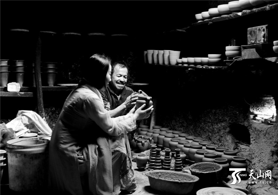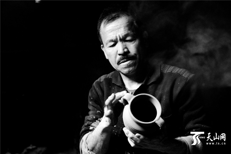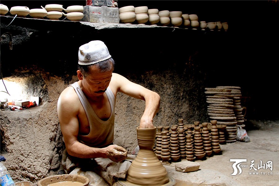 第六代土陶艺人吾麦尔·艾力在制作陶坯