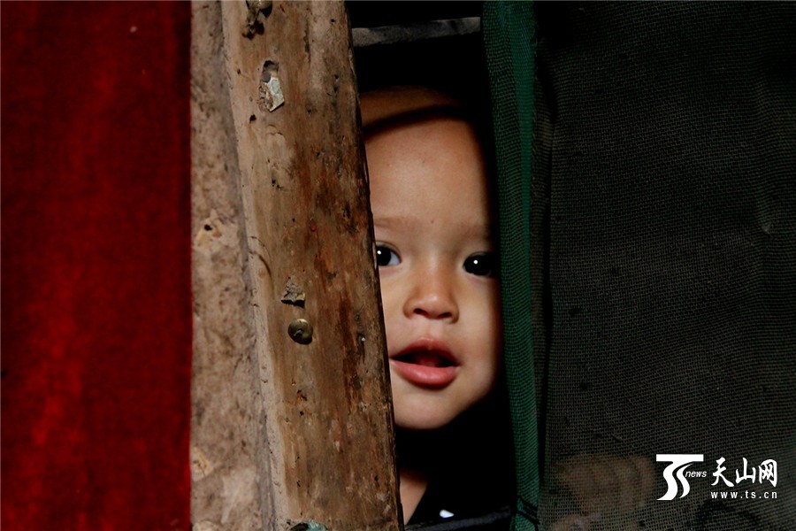 一个小孩带着羞涩又好奇的眼神透过窗户望着慕名而来的游客