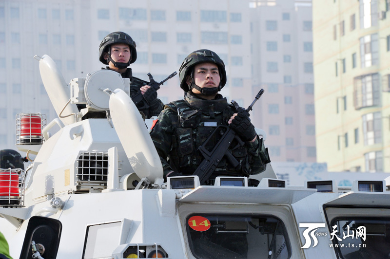 武警官兵在和田市主要街道和重点部位进行武装巡逻。(新疆日报记者卢民一 阿扎提?玉素甫江摄)