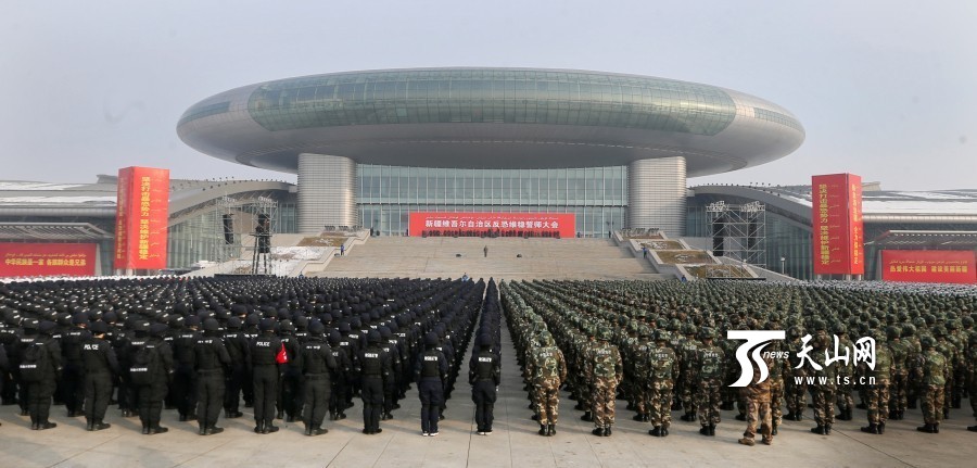新疆国际会展中心广场上,1万余名武警官兵、公安干警、民兵预备役人员等各维稳力量紧握钢枪盾牌、整齐列队挺立,直升机在空中盘旋,一辆辆军车、装甲车、摩托车列队待发。