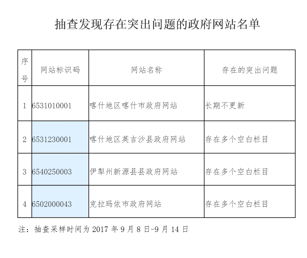 三季度网站抽查工作中,大部分单位的网站内容维护及时,运行正常,但仍然存在一些问题,一是少数地方工作落实不到位,个别政府网站问题仍较突出。喀什地区喀什市政府网站、英吉沙县政府网站、伊犁州新源县政府网站、克拉玛依市政府网站存在栏目更新不及时、空白栏目数超过5个等问题。