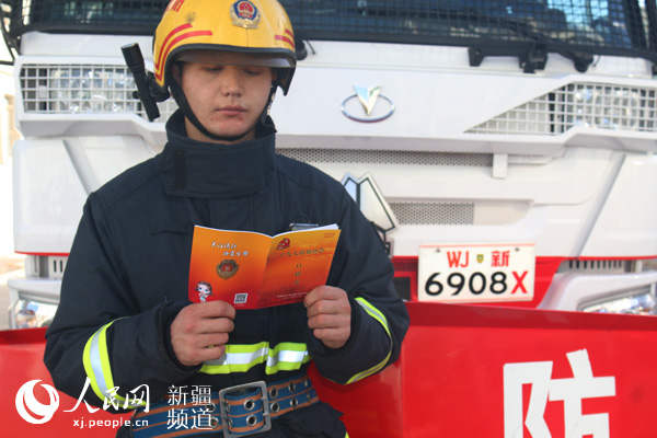 克州公安消防支队乌恰县大队官兵通过口袋书学习领会十九大报告精神。丁羽翔 摄