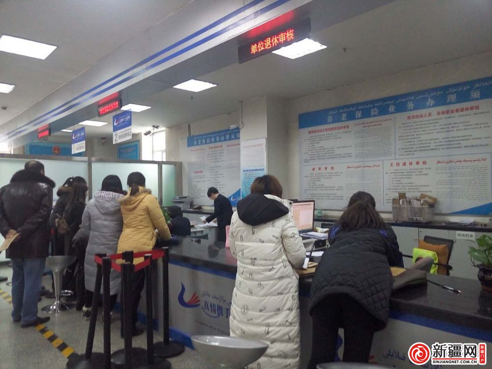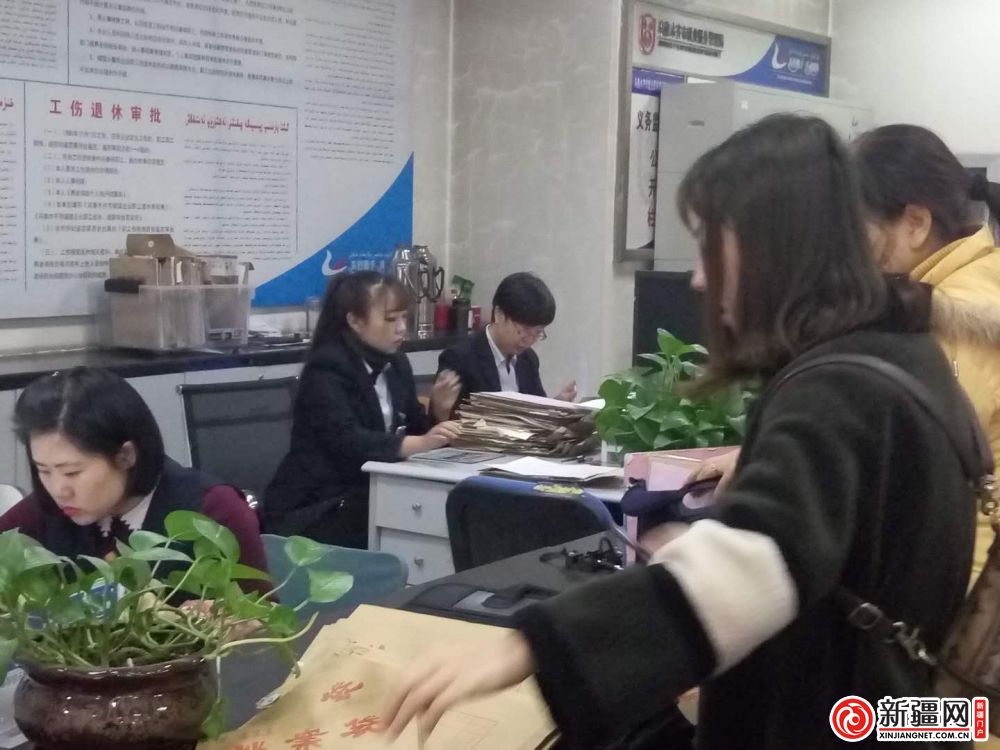 乌鲁木齐市社保局一楼服务大厅工作人员正在给参保者办理业务。