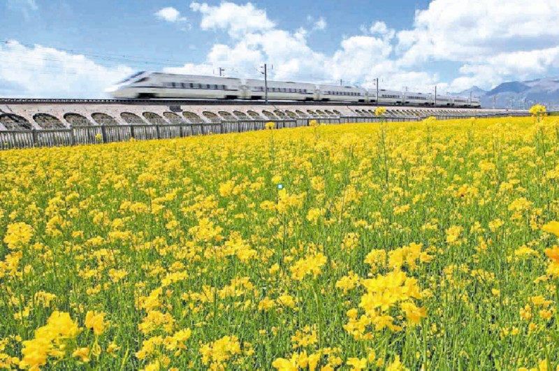 一列动车组列车从青海门源油菜花田旁驶过(2015年8月4日摄)。